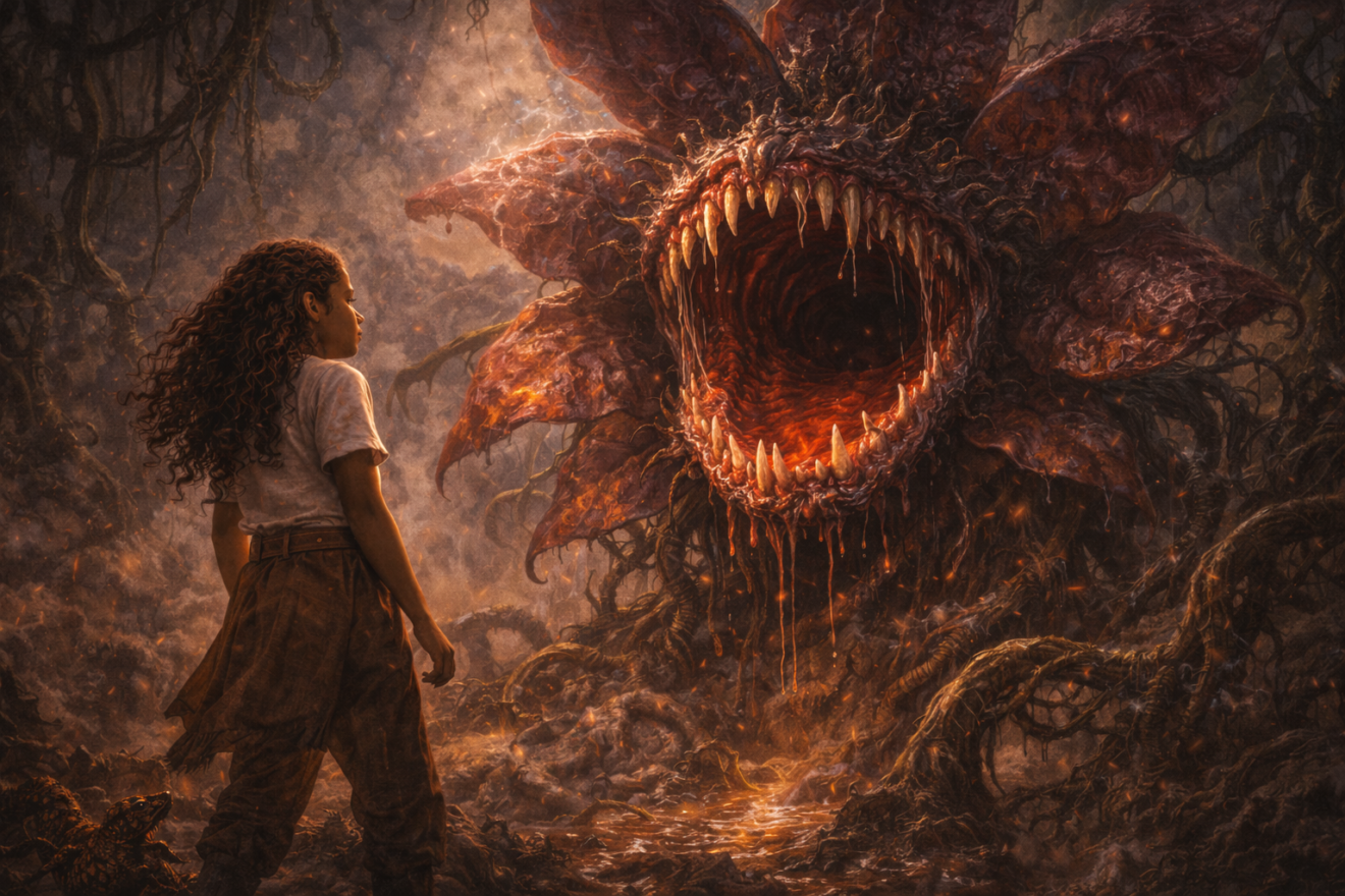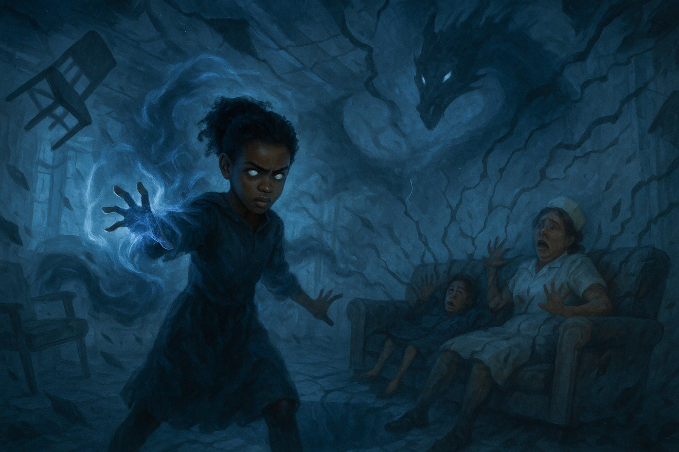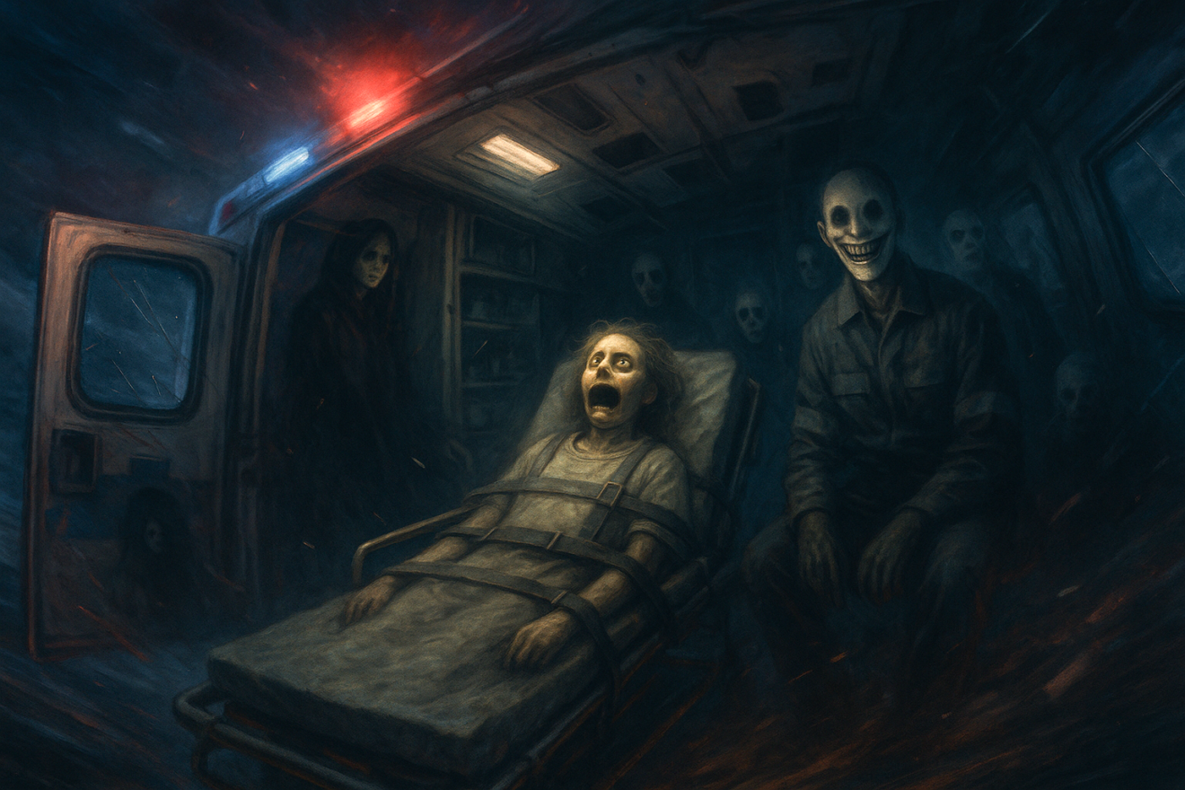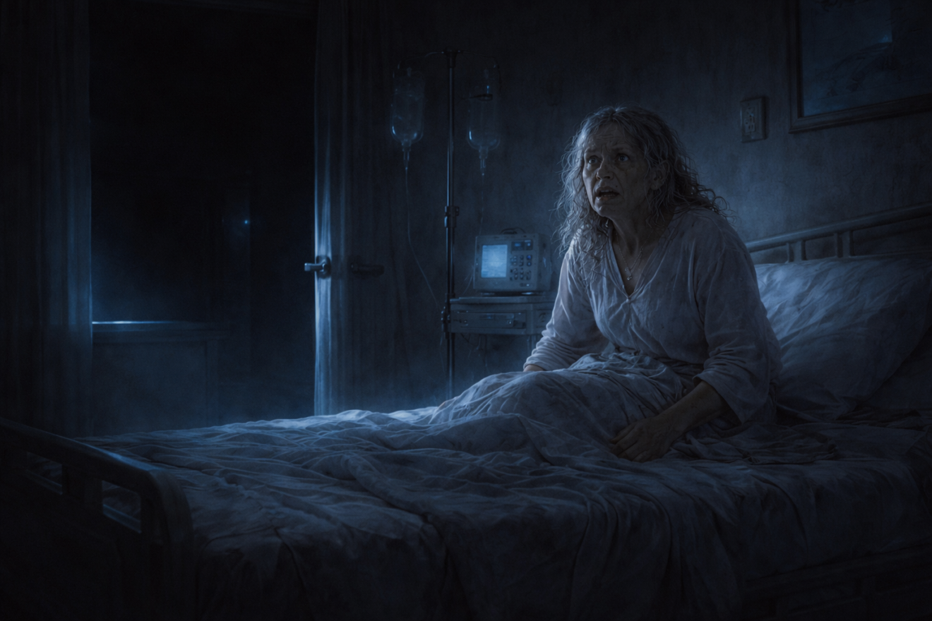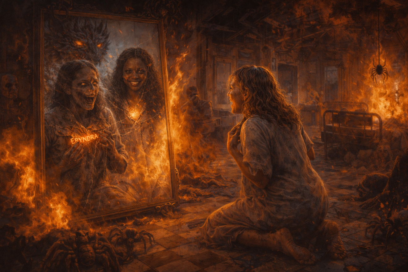 Hébétée, elle se laissa guider. Dans le couloir, les lumières vacillaient. Soudain, les murs de l’hôpital se couvrirent du visage souriant d’Eryndra. Partout, des centaines de sourires étaient peints sur les cloisons. À chaque pas, elle hurla. Des marques rouges apparurent sur sa peau, comme des coups de fouet invisibles.