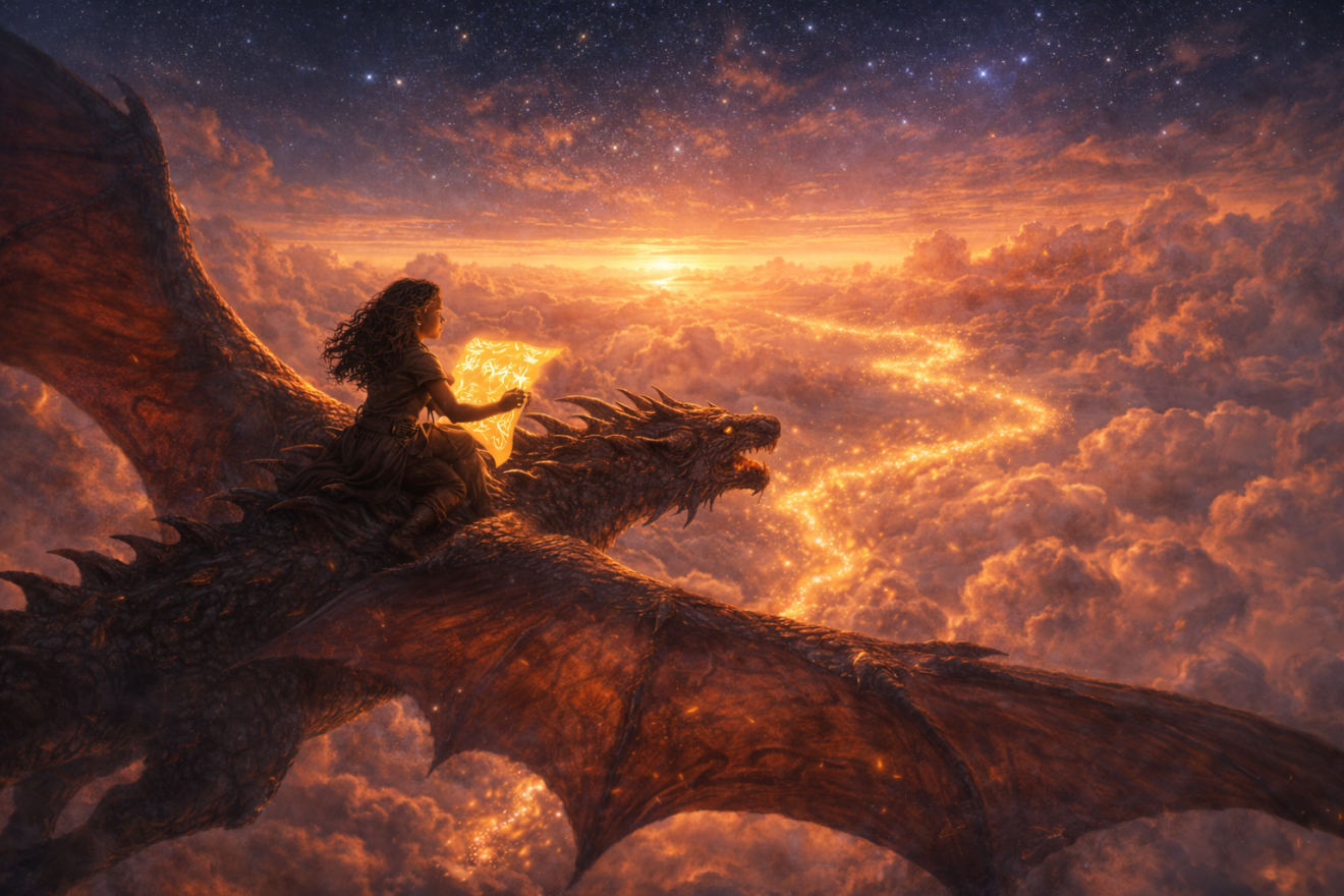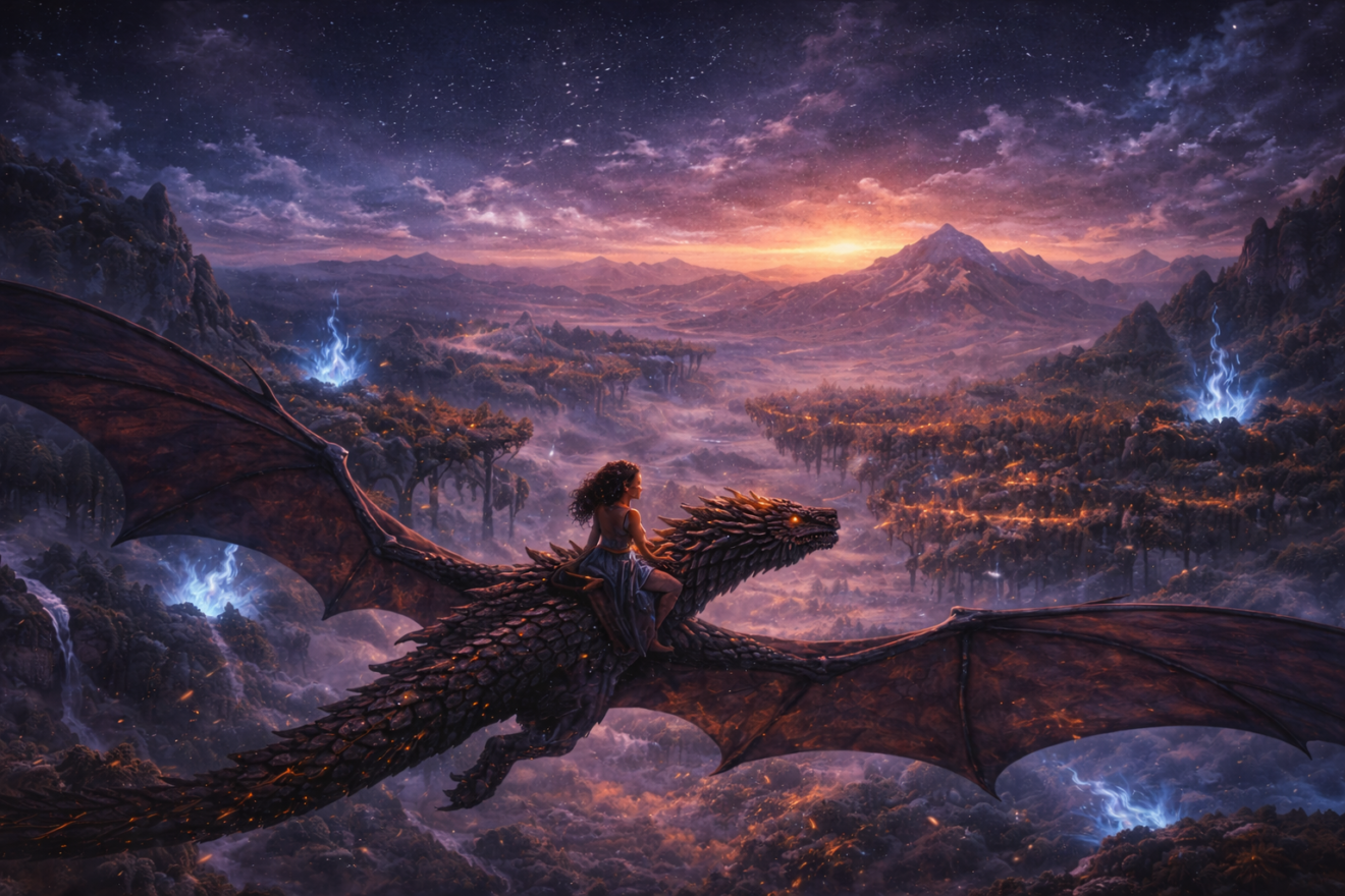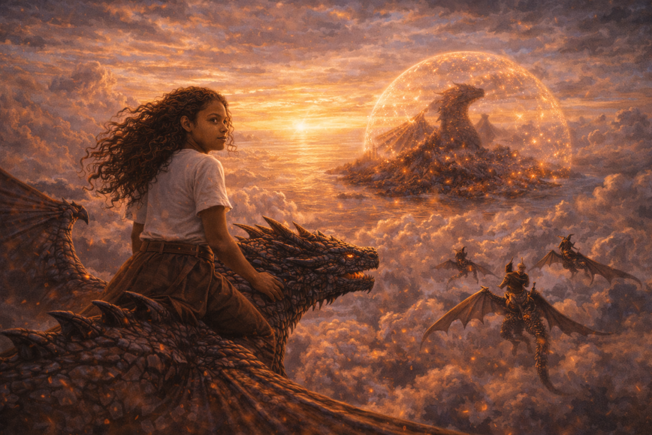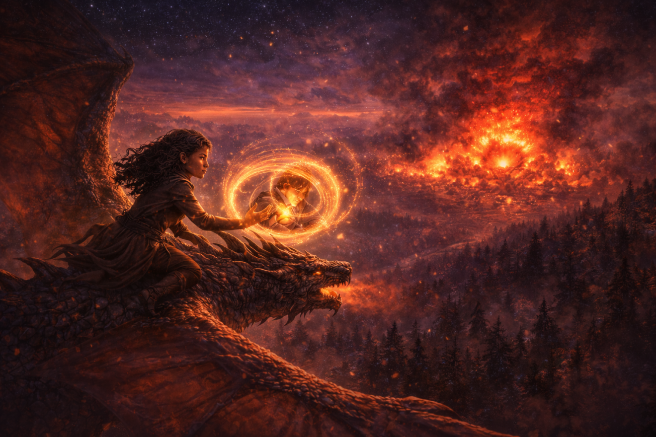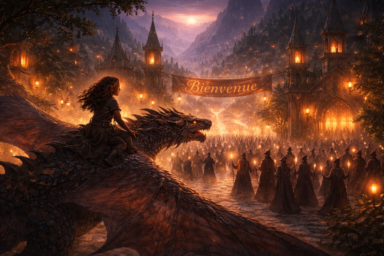 Eryndra sauta sur le toit, grimpa sur le dos de son dragon, et s’envola vers la lumière.