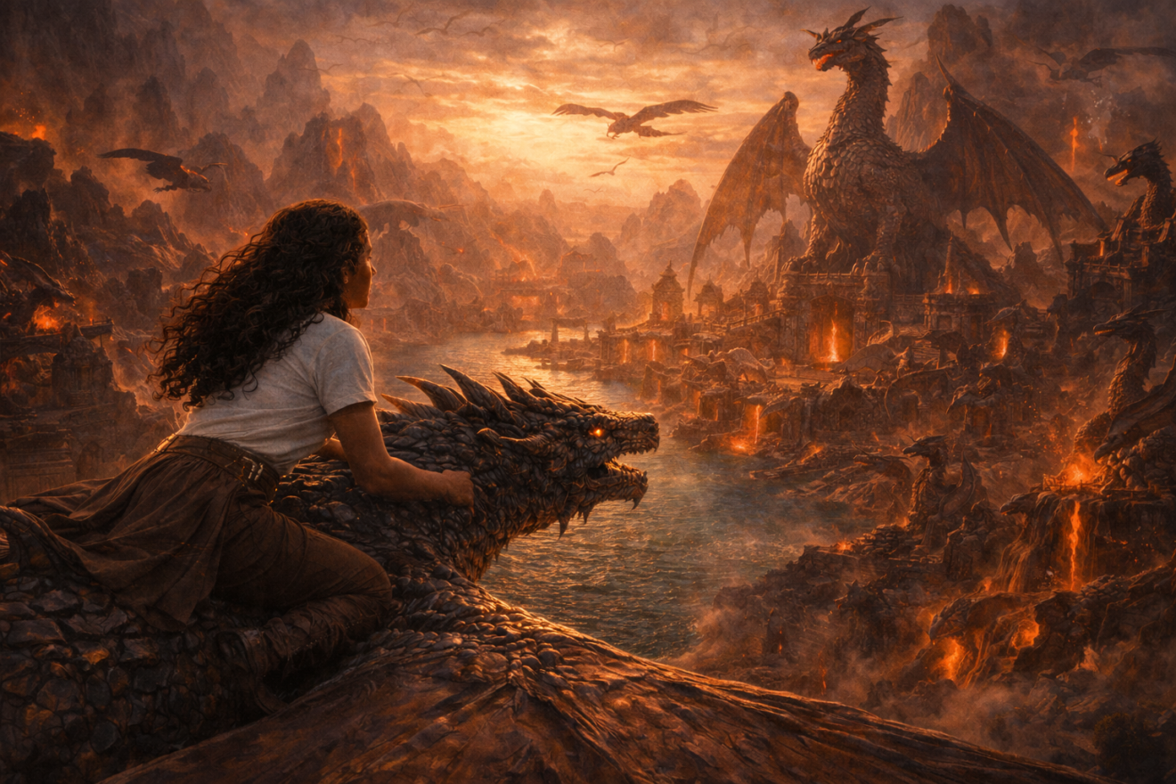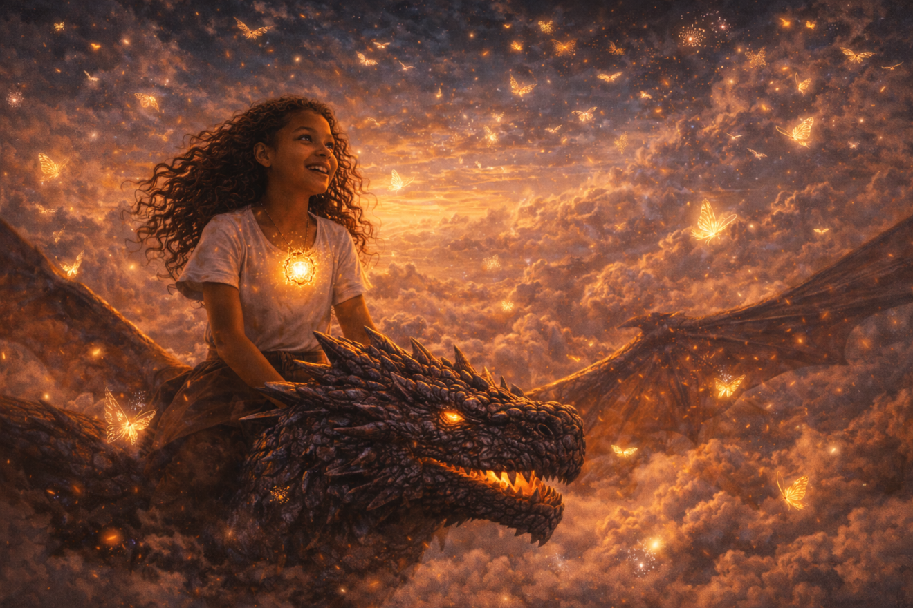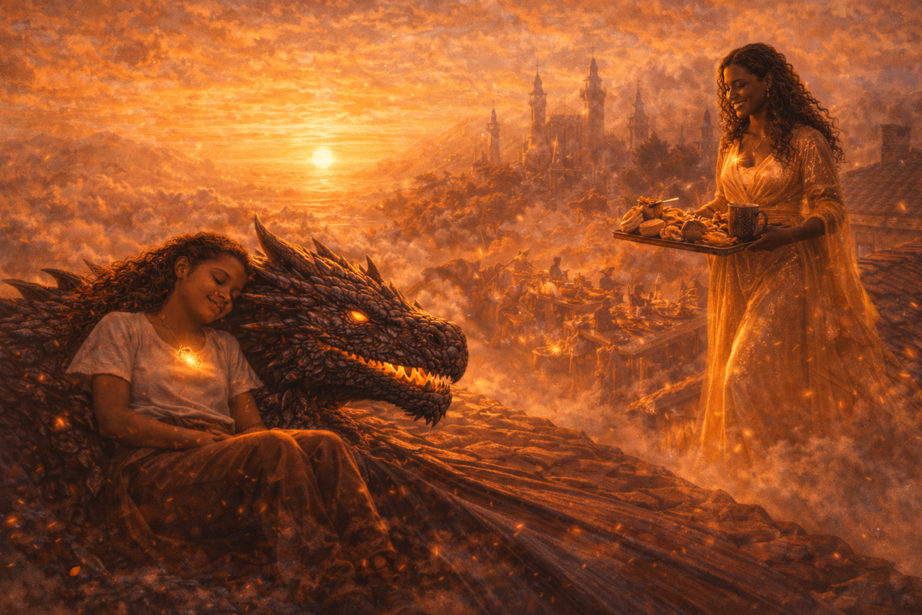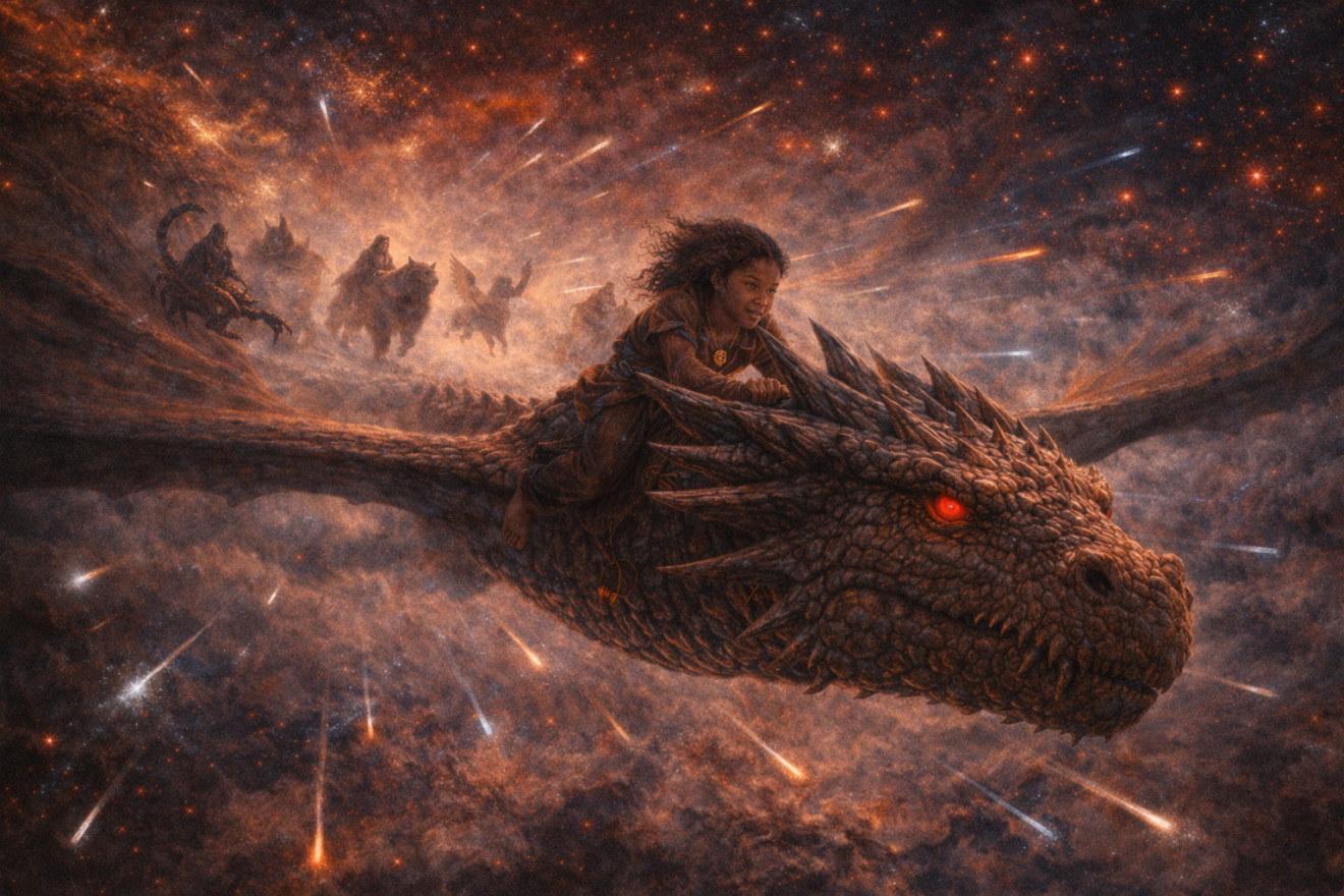 Eryndra sauta sur le toit, grimpa sur le dos de son dragon, et s’envola vers la lumière.