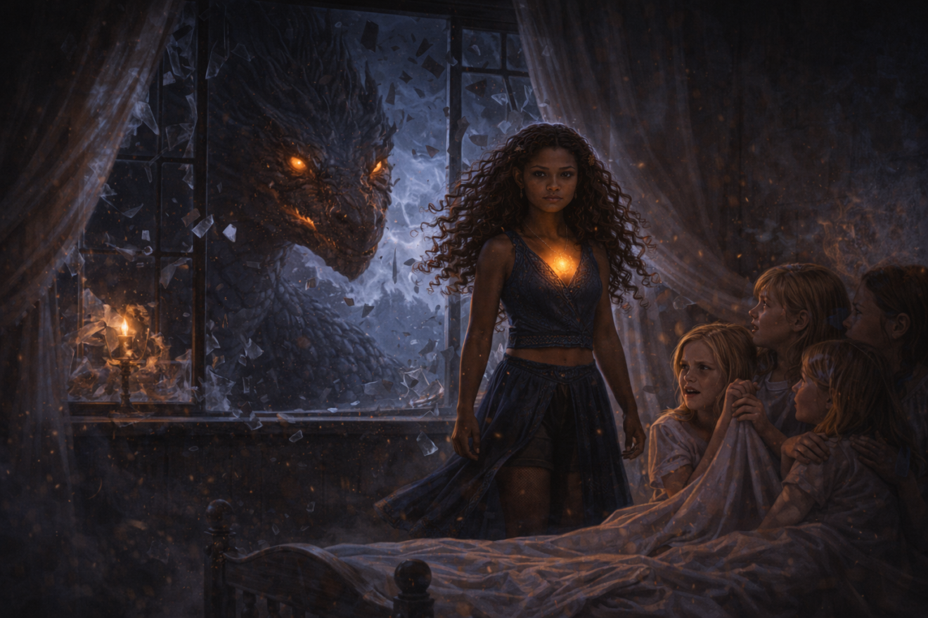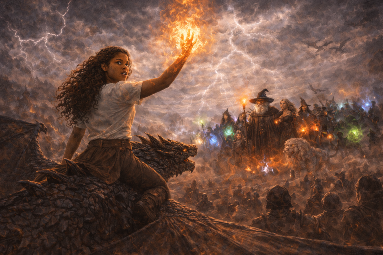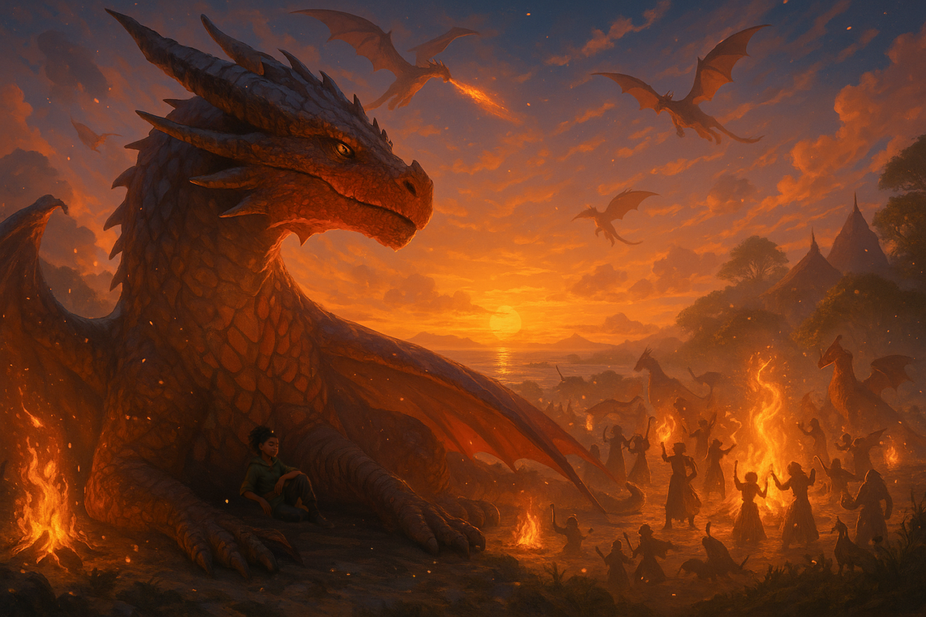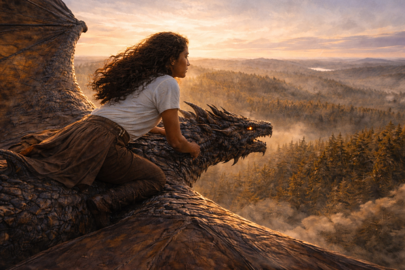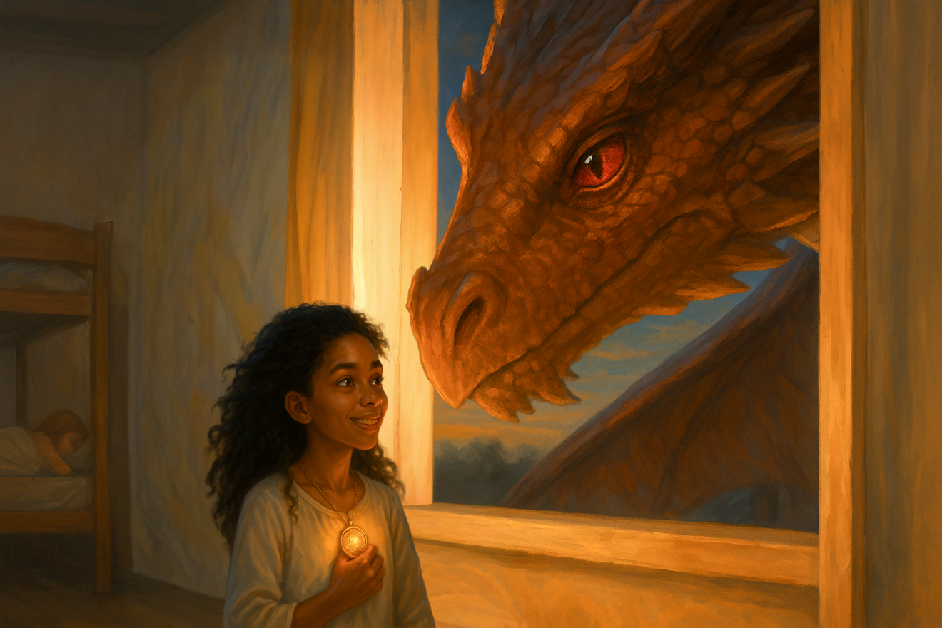 Eryndra sauta sur le toit, grimpa sur le dos de son dragon, et s’envola vers la lumière.
