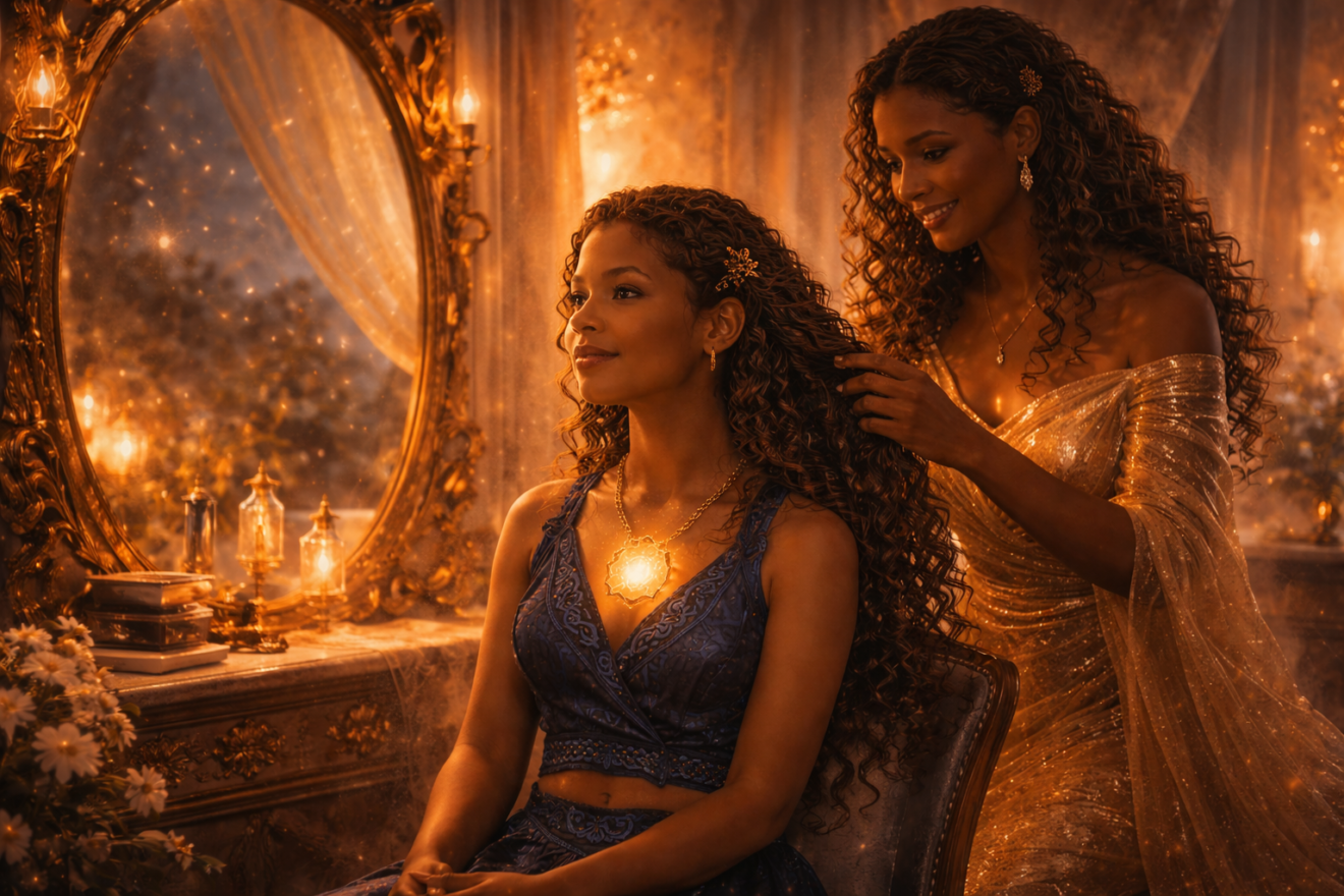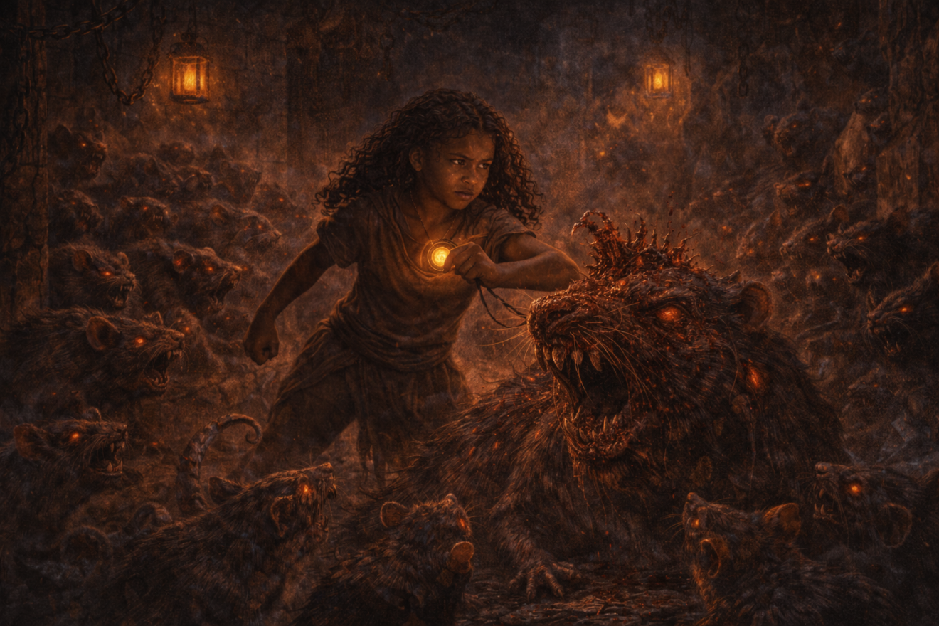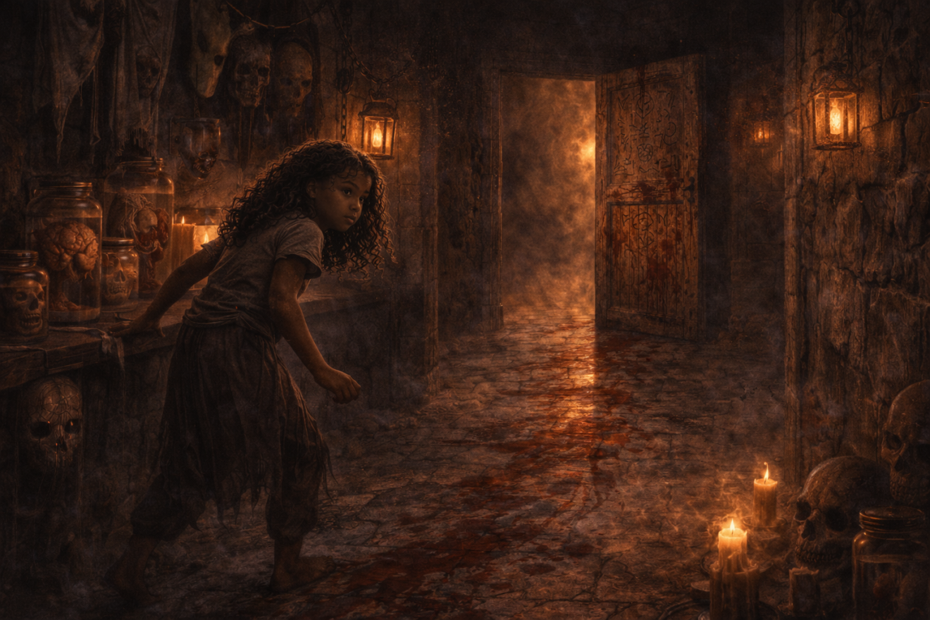 La maison était immense, avec ses escaliers en colimaçon qui semblaient ne jamais finir. Aux murs, il n’y avait pas de trophées ni de photos, seulement des toiles d’araignées tressées comme des couronnes sombres, des masques aux regards vides, des statues qui semblaient presque vivantes.