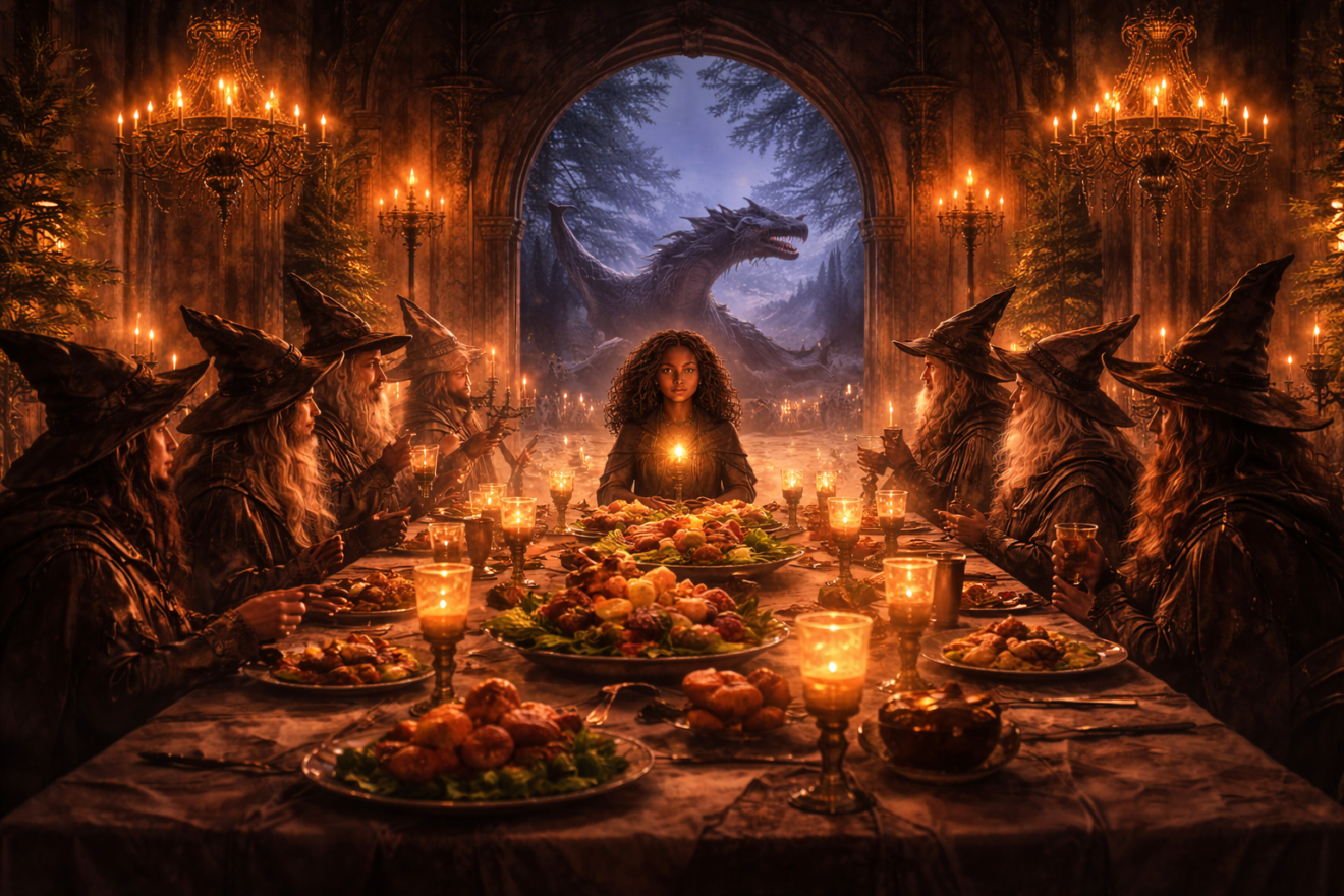 Eryndra retrouva sa famille autour d’un grand dîner, chez le chef des sorciers.